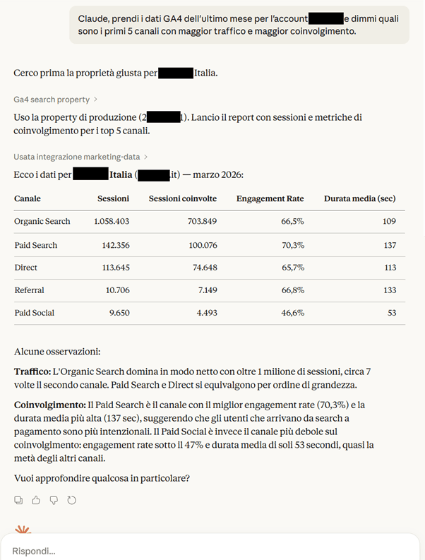 “Claude, prendi i dati GA4 dell’ultimo mese per l’account X e dimmi quali sono i primi 5 canali con maggior traffico e maggior coinvolgimento.”