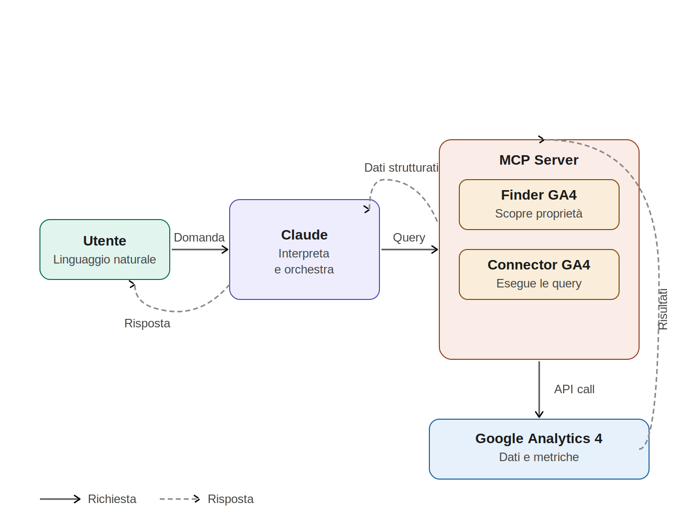 Questo significa che l’utente non deve sapere come funziona GA4, quali API chiamare, o dove si trova una proprietà. Scrive una domanda in linguaggio naturale: